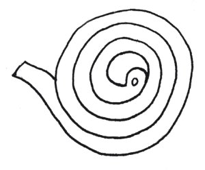Для оплетки можно использовать различные материалы: тонкий шнур, сутаж, тесьму, узкую ленту, нитки, но лучше всего для этой цели подходят кожаные полосочки. Чтобы получить достаточно длинную полоску из сравнительно небольшого куска кожи, можно воспользоваться нехитрым приемом – вырезать ее по спирали (рис. 12), стараясь резать ровно. Нам нужно несколько полосок, чтобы их суммарная длина была в три раза больше оплетаемого края. После этого полоски увлажняются теплой водой и наматываются с натягом на бутылку. Высохнув, полоска станет ровной; середина кожи в работе не используется – слишком велика крутизна спирали.