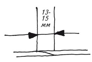 Чтобы срастить наши полоски, их края нужно сшерфовать, намазать клеем, сложить (рис. 13) и плотно сжать. При оплетке нужно стараться, чтобы место склейки оказалось на изнаночной стороне оплетаемых деталей или между соседними отверстиями.