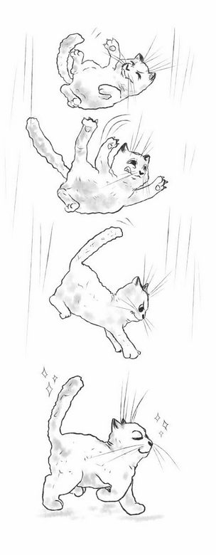 С конца XIX века люди пытались понять, как у кошки при падении с высоты получается так ловко приземляться на лапы. Математик Ричард Монтгомери разработал целую теорию, которая получила название «Задача о падающей кошке». Согласно ей кошка, падающая спиной вниз, переворачивается спиной вверх, даже если кинетический момент равен нулю.