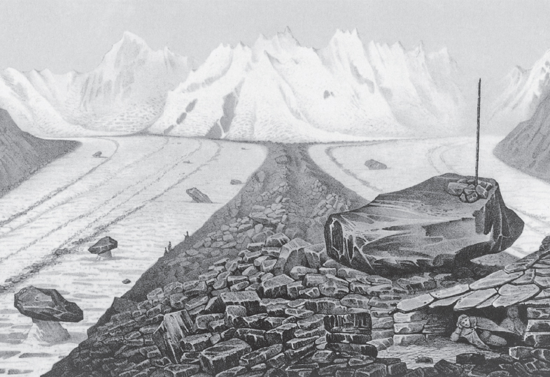Stützpunkt von Forscher Franz Josef Hugi auf dem Unteraargletscher, der «Hugiblock» und die Steinhütte (vorne rechts), Vorläuferin des Hotel Neuchâtelois, 1827.