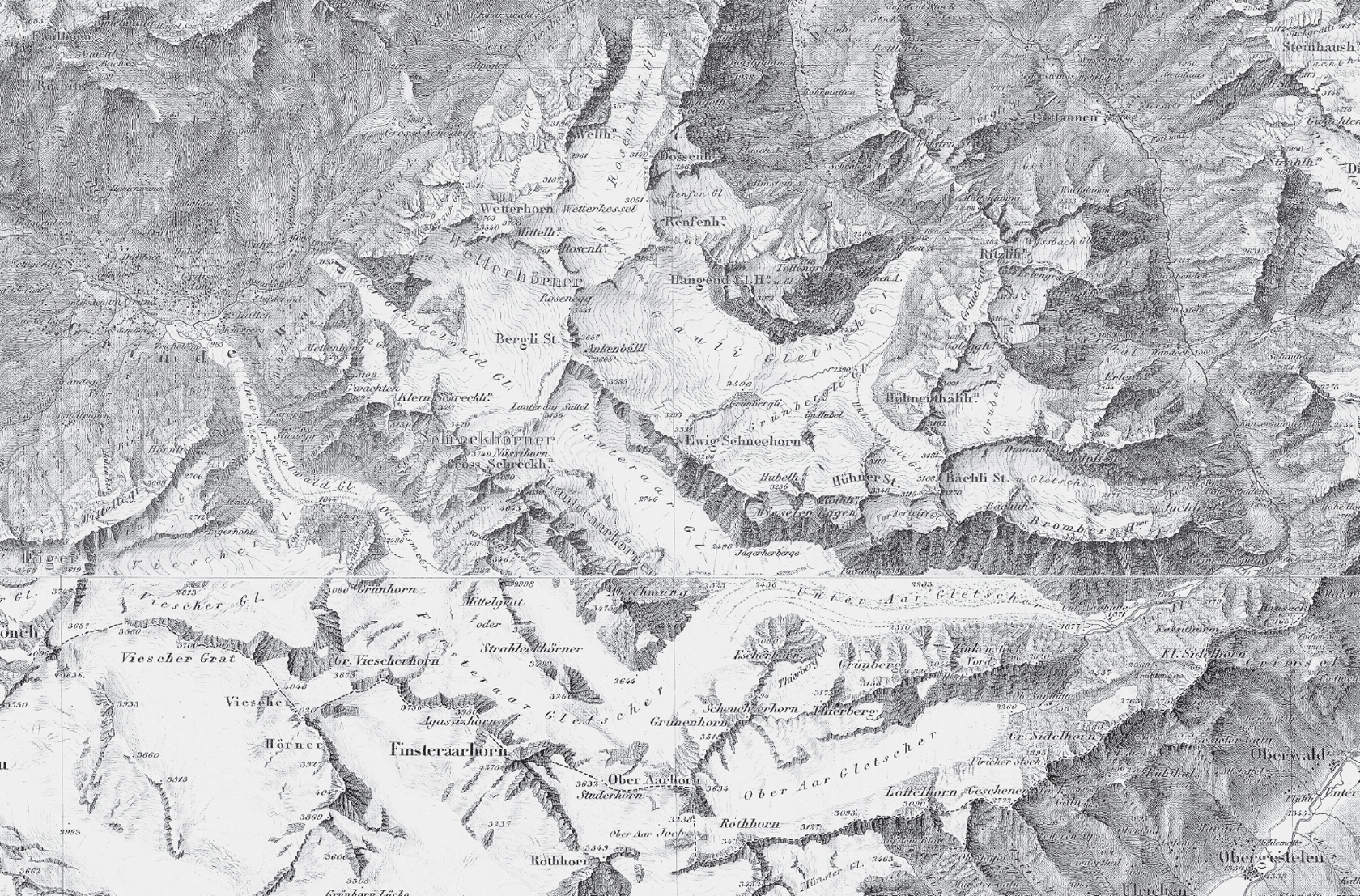 Später, beim Queren einer steilen und gefrorenen Schneepassage, verliert Hinchliff den Halt und schiesst «wie ein Blitz» in die Tiefe. «Unter mir sah ich ein Meer von Spalten, auf das ich hilflos zusteuerte. Zum Stillstand kam ich glücklicherweise in einer kleinen Spalte, die schmal genug war, um mich aufzuhalten, aber nicht breit genug, mir Harm anzutun.» Melchior steigt aufgeregt zu ihm ab. Für den Rest des Abstiegs nimmt er die Engländer ans Seil. An steilen und schwierigen Felsen sichert er die beiden daran hinab. So gelangen sie zum Unteren Grindelwaldgletscher und über einen schmalen Pfad hinab ins Dorf. Um 16.30 Uhr treffen sie im «Adler» ein.