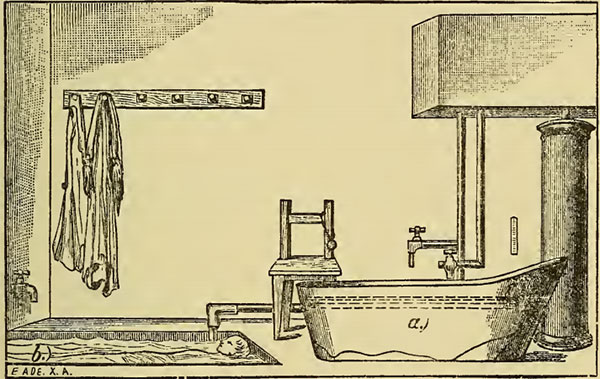 Уже прежде мне приходилось слышать, что в больших общих больницах для бедных больных, которым нечем платить за дорогой хинин, часто применялись ванны, в последнее время в некоторых газетах появилось радостное для меня известие, что во многих, главным образом военных, госпиталях Австрии снова применяют воду для лечения некоторых болезней, как например тиф. Является вопрос: почему же только тиф. Почему и не все те болезни, которые являются последствием лихорадки. Кто говорит А, должен сказать и Б., многие напряженно ждут этого Б, в том числе и специалисты. Я сделаю здесь еще одно замечание, которому пожалуй скорее место в отделе об обмываниях. Не все больные могут пользоваться полными ваннами, некоторые, может быть, уже настолько ослаблены, что не только не могут сами подыматься и поворачиваться, но даже не могут быть подняты с постели.