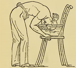 2. Головная ваннаОдна из важнейших ванн для отдельных частей тела – это головная ванна. Ее, холодную или теплую, берут следующим образом, сосуд с водою ставят на стул и погружают в холодную воду верхнюю часть головы (см. рис. 6) на 1 минуту, а в теплую на 5–7 минут. Если вода не доходит до задней части головы, то следует обливать это место рукой, то есть волосы, оставшиеся сухими, можно тоже смочить.
