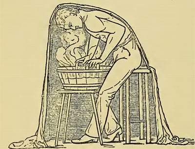 Приготовляется она так: На стул для сидения расстилается широкое и плотное шерстяное одеяло (в длину). На стул садится пациент, обнажив ноги и нижнюю часть тела. Пред ним ставят ушат, посудину (рис. 9 и 10), как и для головной ванны, наполненный кипятком более, чем до половины. На верхних краях посудины, по сторонам ушек помещают две неширокие дощечки, на которые можно было бы поставить ноги. Дощечки эти нужно укрепить как-нибудь, чтобы пациенту не нужно было бояться обварить ноги от соскальзывания. Когда больной занял уже место, то посудину обворачивают и закрывают плотным шерстяным одеялом так, чтобы пар не пропадал, а подымался по одеялу, как по трубе (рис. 11). Для ножных ванн я употребляю вскипяченные отвары из сенной трухи, но менее крепкие. Как и в вышеупомянутой ванне (для головы), можно усилить выделение и действие паров, опуская раскаленный кирпич в воду, минут 5–10 после начала ванны, бросать кирпич не годится, так как кипящие брызги могут причинить ожоги. Число раскаленных кирпичей и продолжительность ванны обусловливаются, конечно, силой желаемого действия. Иногда нужно, чтобы потели только нижняя части ног – например, при страданиях ножным потом, иногда должны потеть ноги и бедра, часто и живот, даже все тело. Для самого легкого действия ванна длится минут 15–20, и достаточно одного раскаленного кирпича или камня, для наиболее сильного действия нужно 25–30 минут, и раскаленные камни нужно опускать каждые 5–10 минут.