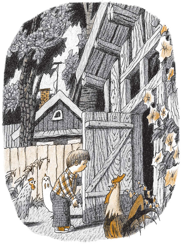 Он вышел во двор. Там был сарай, половина которого занята была дровами, а на другой стоял верстак и лежали инструменты. Некоторые из них Петька видел в школе на уроках труда. За этим сараем был другой, гораздо больше первого. В нём было сено, стояли сани, лежали грабли, лопаты, на стене висели три косы. Много там было всяких других вещей, в которых Петька решил разобраться потом. В другом конце двора был коровник, курятник и пристройка для свиньи. Коровы не было, куры бродили по двору, а свинья была на месте: толстая, розовая. Она поглядела на Петьку хитрыми глазками с белыми ресницами и хрюкнула, будто поздоровалась: «Привет, братец». Петька отвернулся. Вспомнилось, что мама часто называла его поросёночком за упитанность и розовый цвет. Нет, свиней Петька не любил. Другое дело собаки. Ещё когда телега въезжала во двор, Петька увидел высокого серого пса с белой грудью и закрученным в кольцо хвостом. Пёс прыгал вокруг тёти и дяди, но не лаял. Всё равно было видно, что он очень радуется.