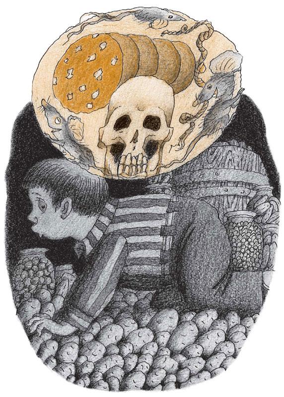 Над погребом звякнуло. «Петя?» – услышал он негромкий тёткин голос и притаился. Раздался скрип половиц: тётка пошла из кухни. Петька подождал немного и толкнул крышку погреба. Она показалась ему отчего-то уж очень тяжёлой. Появилась щель, но картофелина пока ещё не влезала. Петька опустил крышку, встал поудобнее, набрал воздуху в грудь и упёрся как следует. Крышка стала медленно отходить и вдруг со звоном отскочила, и на Петьку обрушился холодный водопад. «Ая-а-а-й!» – взвыл Петька и рухнул с лестницы на картофельную кучу. А с краёв люка на него лилась и лилась вода.