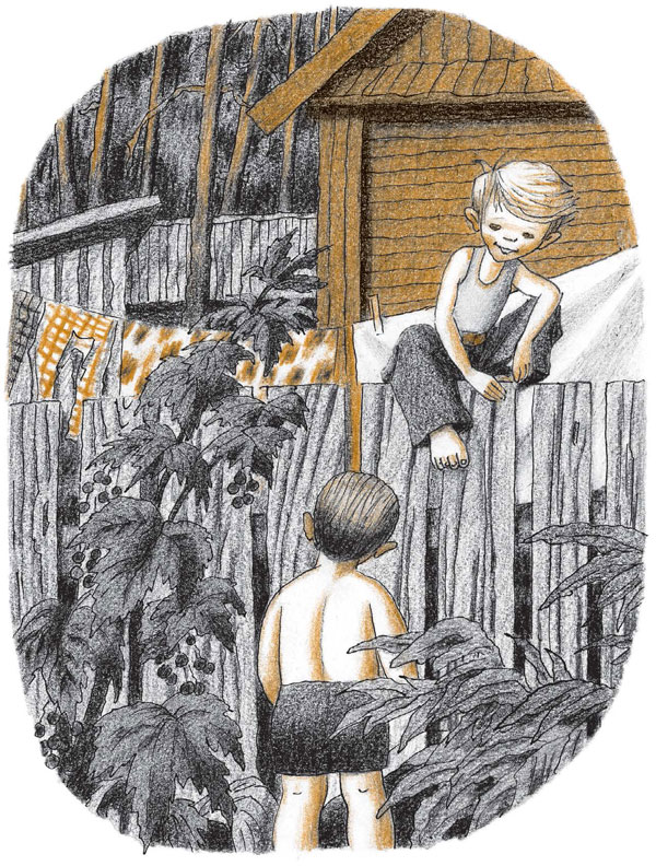 Голос шёл со стороны соседского забора. Петька оглянулся и увидел над забором мальчишку, вихрастого и веснушчатого, в майке и брюках. Босые ноги свешивались на Петькину сторону. Мальчишка Петьке понравился, несмотря на серьёзное, даже чуть хмурое лицо. А может, именно поэтому: ведь и во дворе, и в школе мальчишки начинали нехорошо улыбаться, как только видели его.