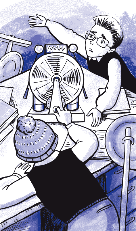 В углу лежали старые объявления на ватмане. Витик сложил одно вчетверо, проделал в нем дыру и надел на трубу, как большой воротник. Снова завертелись колеса, снова рванулась теперь уже знакомая искра, но проскочила она на этот раз прямо через трубу, как будто и не было там непроходимого для нее холодного воздуха.