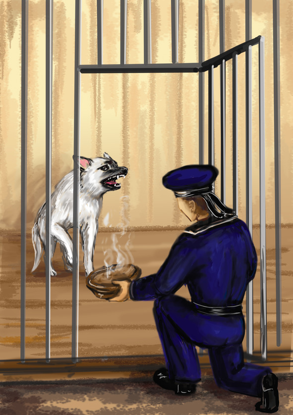 Едва Пальма вошла в Вольер, как тут же ей в нос ударил резкий запах какой-то другой собаки, возможно, которая была раньше до нее. Боль ее от потери хозяйки как-то притупилась и спряталась где-то глубоко. Пальма понимала, что нужно жить дальше… Но, месть, месть этим предателям людям она прибережет на «сладкое». День близился к вечеру, когда все собаки начали истошно лаять, и Пальма услышала какой-то странный лязгающий звук. Встав задними лапами на дверь Вольера, она увидела вереницы людей, которые что-то несли в руках. По запаху Пальма учуяла пищу, слюна начала капать на ее роскошную шерсть, все-таки голод давал о себе знать. Матросы дошли каждый до своего Вольера и начали по команде взводного открывать двери. Пальма отпрянула вглубь Вольера и, оскалившись, стала ждать. Открылась дверь и появилась чья – то рука, которая ставила котелок на пол. Пальма с быстротой молнией метнулась к этой руке и что было силы, впилась зубами в это ненавистную человеческую плоть. В этой ее хватке была вся боль, боль от человеческого предательства, ненависть ко всем людям. Человек выхватил руку и, скривившись от боли, встал около Вольера. Пальма увидев, что дверь закрылась начала жадно «улепетывать» такую сейчас вкусную кашу, в которой редкими кусками плавало мясо. Она ела и посматривала одним взглядом на того человека за Вольером, ожидая нападения, ведь она его укусила и сделала ему больно. Но, нет, он, молча, и неподвижно стоял, и ждал, когда она наестся. Котелок удивительно быстро опустел, и Пальма с довольным видом залезла в будку на солому. Вдруг, опять открылась дверь, и в Вольер вновь вошел этот парень. Пальма начала рычать и соображать: «Сейчас в него впиться или подождать? Странно, думала Пальма, почему он меня не боится? И не ругается?». Между тем парень сел на карточки и начал говорить с Пальмой. Пальма ничего не понимала, но в его словах чувствовалась любовь, теплота, о которой Пальма так соскучилась. Постепенно собака перестала рычать и молча, положив голову на лапы, стала смотреть на этого странного парня, слушая его слова. А он все говорил и говорил и постепенно Пальма начала привыкать к его голосу. Через некоторое время он встал, взял котелок и вышел из Вольера. Пальма осталась одна. Ей вдруг стало жалко – этого парня, которого она укусила за руку вместо того, чтобы поблагодарить за принесенную еду. Ведь он не виноват в предательстве. С этими мыслями Пальма постепенно погрузилась в сон. В этот раз ей не снилось ничего. Неужели сердце успокоилось?…