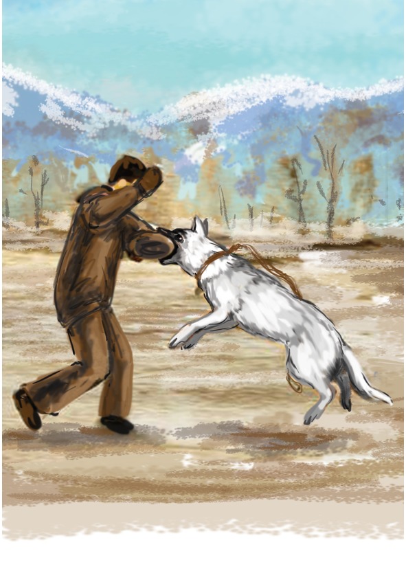 Но, вот настала команда «Фас». Пальма, сидя, у левой ноги хозяина наблюдала, как откуда-то из кустов появляется нарушитель, и громко крича и стреляя в воздух, начинает с агрессивными намерениями приближаться к ней и ее дорогому хозяину. Пальма не замечала, как слюна от возбуждения капает на ее прекрасную белую шерсть, ее тело все сотрясалось от мелкой дрожжи. Все ее естество просто «кричало»: как сейчас эта сволочь хочет напасть на ее любимого хозяина и причинить ему боль. Эта мысль как бешеный колокол стучала в мозгу собаки. А он был все ближе и ближе. Ближе и ближе. Хозяин!!!! Что же ты медлишь и не даешь мою любимую команду!!!??? И… Пальма не выдержала и, взвившись, в воздух в два прыжка настигла нарушителя, схватит его за запястье, и с остервенением повалив его мощным рывком на землю. К ней подбежал хозяин и крикнул команду «Фу». Собака беспрекословно бросила нарушителя тщетно пытавшегося вырваться из ее железной хватки и села у левой ноги хозяина. Посмотрев в его глаза, она увидела в них печаль. Печаль? «Что случилось дорогой мой хозяин? И вдруг Пальма поняла, она кинулась на этого проклятого нарушителя без команды!!! Боже! Как я подвела хозяина. Но я же хотела просто его защитить!?»