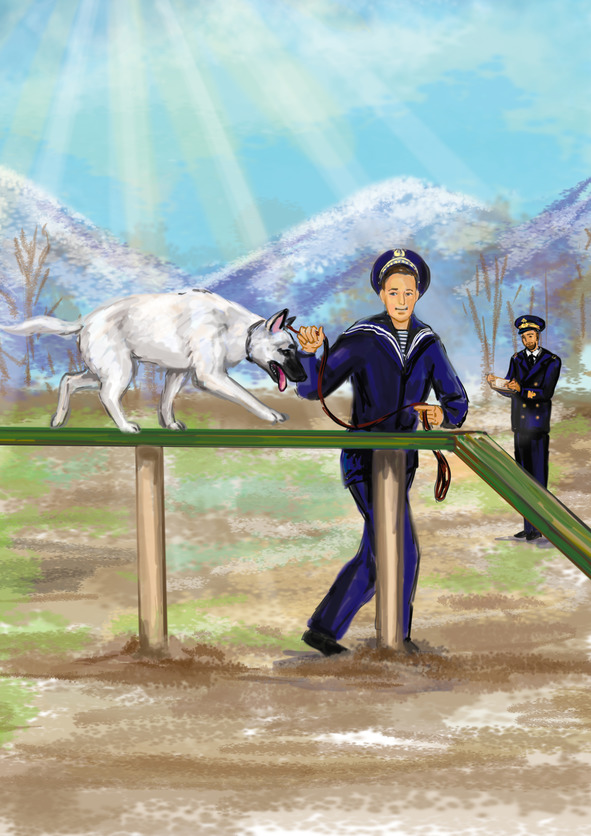Сорок собаководов построились в одну линию на дрессировочной площадке. Перед ними стояли офицеры, которые объясняли, как будут проходить экзамены. Каждый дрессировщик должен будет со своей собакой по очереди выполнить все упражнения из ОКД (Общего курса дрессировки).