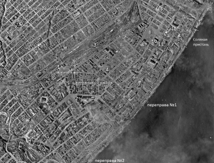 А. Комсомольский сквер; Б. площадь Павших Борцов; В. площадь 9 января; 1) Центральный вокзал 2) Универмаг; 3) железнодорожное депо; 4) школа имени КИМ; 5) южный «дом специалистов»; 6) «дома специалистов»; 7) Госбанк; 8) дом «военторга»; 9) комплекс зданий НКВД; 10) будущие дома Заболотного и Павлова; 11) мельница № 4 им. Грудинина; 12) будущие «дом железнодорожников» и «г-образный дом»; 13) Военно-политическое училище