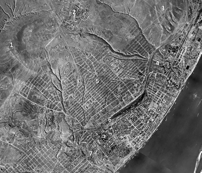 Немецкое аэрофото от 17.09.42. Центральный (Ерманский район) Сталинграда. Схема расположения объектов: 1 – высота 112.5; 2 – Авиагородок; 3 – высота 102.0 (Мамаев курган, район баков); 4 – овраг Долгий; 5 – т. н. «заполотновский» район; 6 – вокзал Сталинград I; 7 – долина реки Царицы