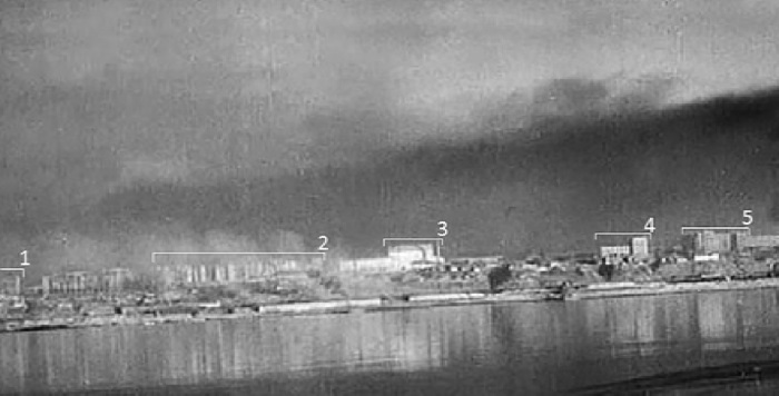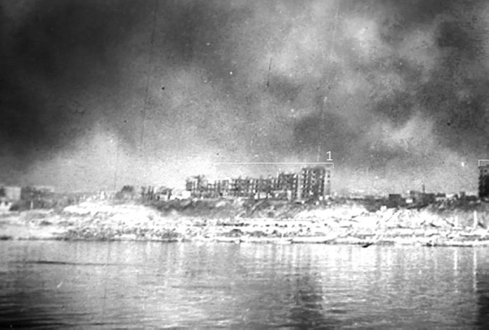 Взгляд с советской стороны, кадр из августовской кинохроники. Панорама берега Волги в районе Соляной пристани, справа горят баки Нефтесиндиката. Здания на фото: 1 – пивзавод; 2 – комплекс зданий НКВД; 3 – мельница; 4 – «дом железнодорожников»; 5 – «г-образный дом». В подвалах комплекса НКВД, пивзавода и мельницы будут располагаться штабы подразделений 13-й гвардейской стрелковой дивизии. «Дом железнодорожников» и «г-образный дом» с конца сентября по декабрь 1942 г. станут немецкими опорными пунктами