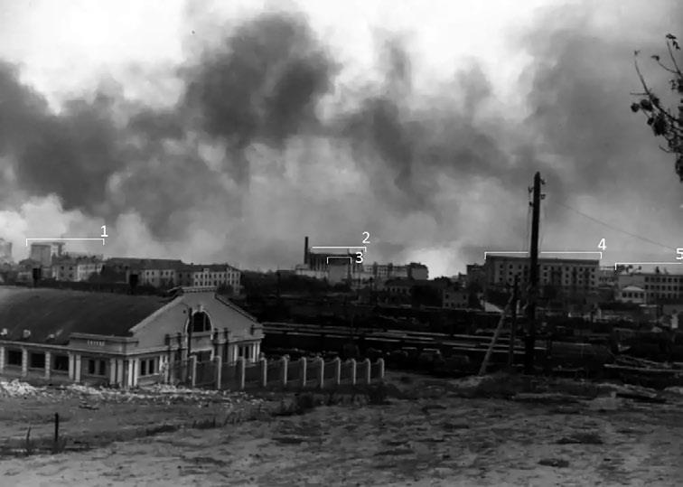 Уникальный немецкий снимок района площади 9 января, сделанный 14 сентября. Совсем скоро здесь развернутся ожесточенные бои за каждый дом, этаж, квартиру. Ведущая к Волге Солнечная улица будет завалена трупами. На фото видны еще не разрушенные здания: 1 – наполовину построенный дом Управления сталинградской железной дороги, более известный из сводок 13-й гв сд как «дом железнодорожников»; 2 – мельница № 4 им. Грудинина, или мельница Гергардта; 3 – еще не разрушенный торец дома Облпотребсоюза, известный на весь мир как «дом Павлова»; 4 – дом Облпищепрома, известный из сводок 13-й гв сд как «военторг»; 5 – школа № 6. Ожесточенные бои за здания на фото также будут описаны в данной книге