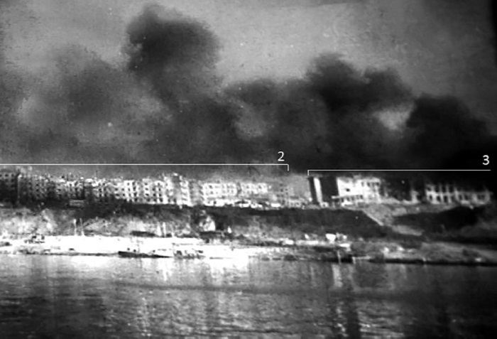 Кадр из советской кинохроники, берег Волги чуть южнее Соляной пристани. Здания на фото 1 и 2 – комплекс зданий, так называемые «дома специалистов», которые были захвачены батальоном 71-й пехотной дивизии 14 сентября и удерживались немцами вплоть до окончания боев в городе; 3 – здание Госбанка – в сентябрьских боях будет переходить из рук в руки, но в результате останется за немцами.
