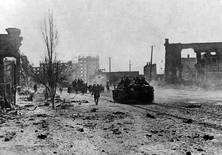 Самоходки из 244-го дивизиона с десантом 194-го пехотного полка на ул. Курской. Машины нагружены ящиками с боеприпасами, рядом идут военнопленные «хиви» с шанцевым инструментом. Вдали виден «дом специалистов»