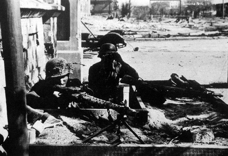 Пулеметный расчет на улице Саратовской, сектор обстрела направлен на юг. С севера фланг 71-й пд прикрывают части 295-й пд, пехота которой в 14:00 вышла к водонапорным бакам на вершине и заняла юго-западные склоны Мамаева кургана