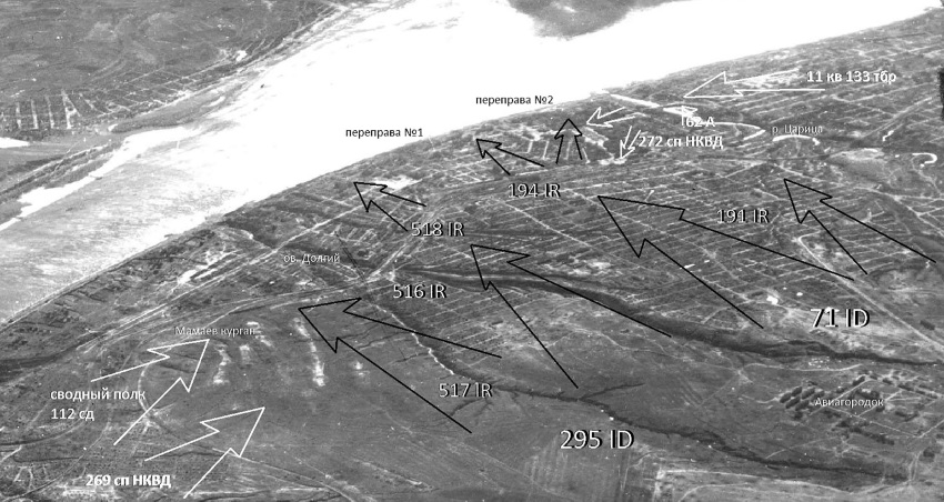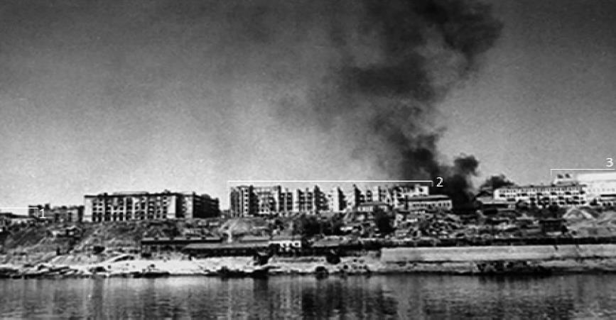 Вдоль причалов была проложена ветка железной дороги, забитая вагонами. Объекты на снимке: 1 – пивзавод; 2 – комплекс зданий НКВД; 3 – мельница № 4. Напротив комплекса НКВД в штольне, прорытой в крутом склоне, располагался штаб 13-й гв сд генерал-майора Родимцева, рядом – штаб 42 гвардейского полка