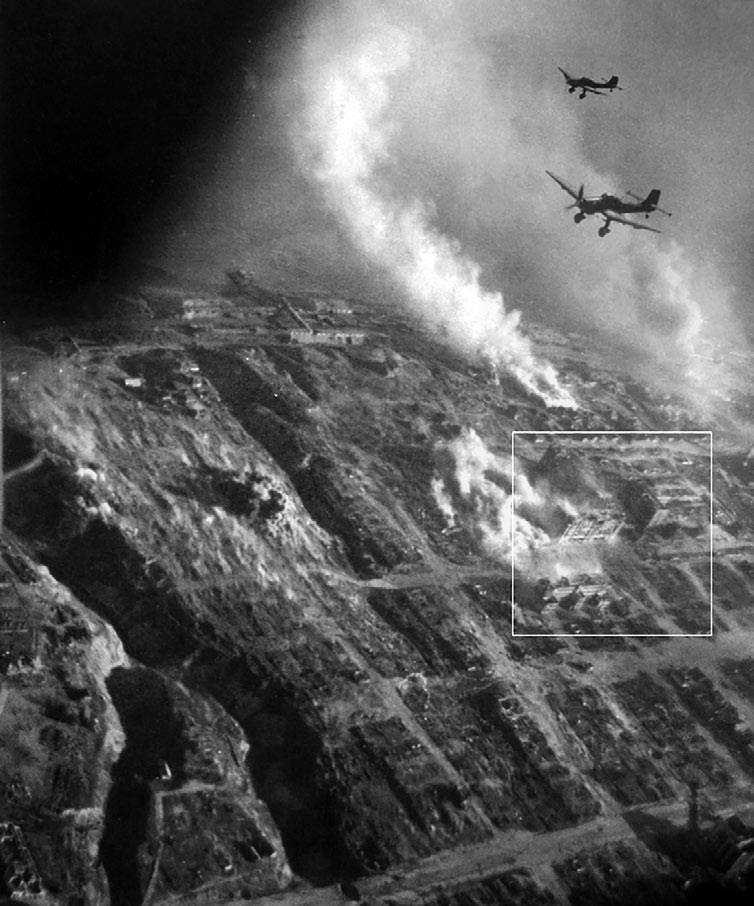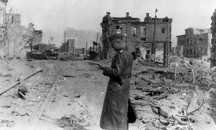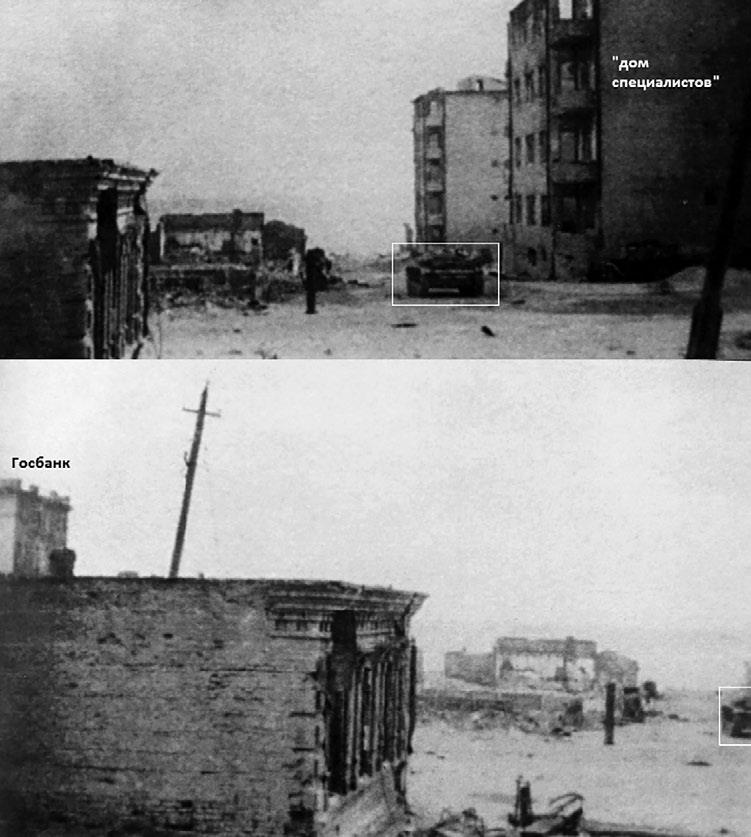 На фото хорошо виден «г-образный дом» (у немцев L-образный), справа недостроенный «дом железнодорожников», ниже через улицу Пензенскую – школа № 38. За здания три месяца подряд шли кровопролитные бои и в начале декабря после двухдневного боя гвардейцы Родимцева наконец захватили эти немецкие опорные пункты