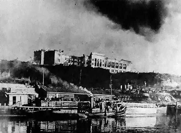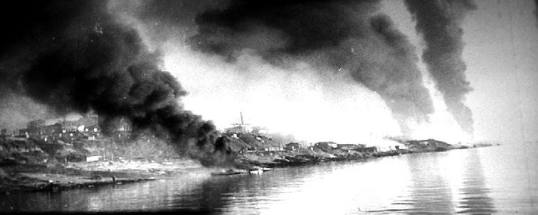 Берег Волги напротив пивзавода и комплекса зданий НКВД, место высадки 42-го гв сп полковника Елина. Вдали в центре снимка видна еще целая труба мельницы № 4, в правой части горит Нефтесиндикат