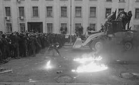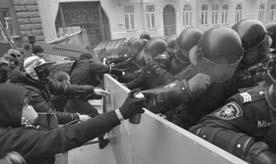 Однако главные события того дня происходили у Администрации президента на Банковой улице. Группа молодых людей, по разным оценкам, от ста до трехсот человек попыталась прорвать милицейское оцепление. В касках, велосипедных и мотоциклетных шлемах, вооруженные дубинками и палками, многие из них скрывали свои лица под масками.