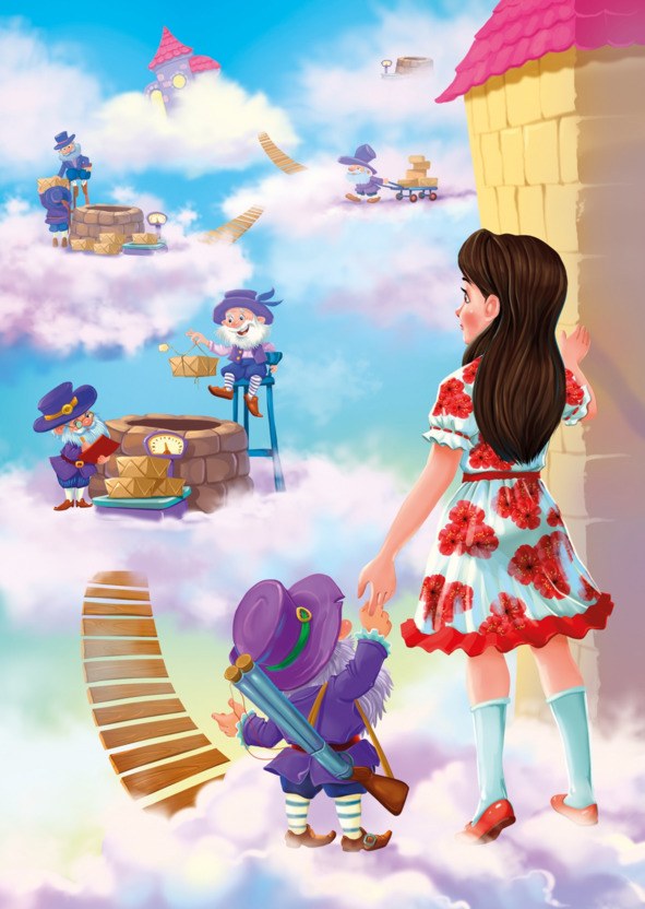 После нескольких часов блужданий Доминика стала чувствовать легкую усталость в ногах и решила разуться и продолжить путь босиком. Взяв в руки свои красные туфельки, она осторожно сделала пару шагов вперед – облака показались очень мягкими и теплыми, и буквально через считаные секунды усталость улетучилась, а глаза засияли как прежде. Девочка продолжала беззаботно свой путь и через некоторое время вышла к горе, которая была сложена из массы плюшевых игрушек. Впервые увидев такую необычную гору, Доминика безумно обрадовалась, уверенная в том, что среди такого количества игрушек точно найдется ее Тинни.