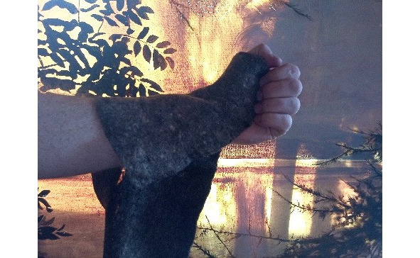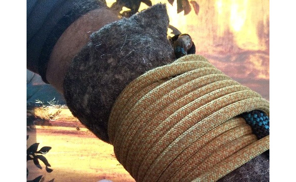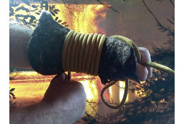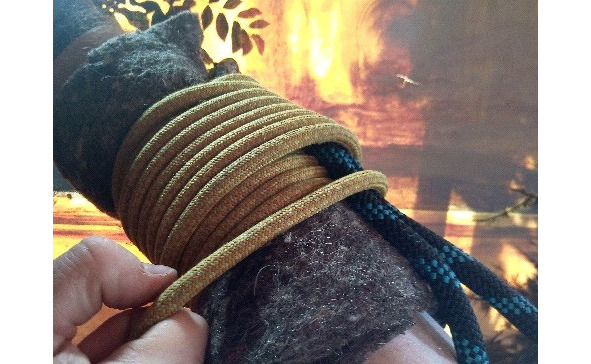 Предварительно на голени и запястья наматывается войлок толщиной – 2—3 мм. Намотка на запястья – плотная, должна быть меньше ширины кисти. В противном случае, веревки будет срывать. Войлок наматывается диагонально, обязательно (!) перекрывая половину кисти по направлению к мизинцу. Если войлок не наложить на кисть, то при нагрузке – веревку сорвет!