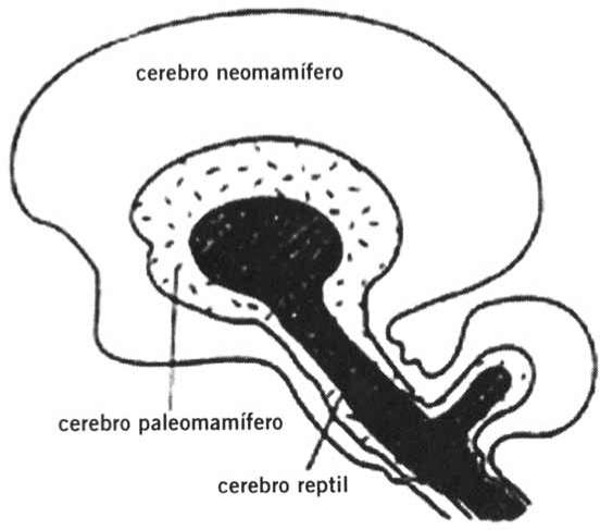 Paul MacLean7 es el creador de una teoría sobre el cerebro humano que ha influido fuertemente en las ciencias cognoscitivas. “El hombre –sostiene MacLean– se encuentra en el predicamento de que la naturaleza lo ha dotado esencialmente con tres cerebros, los cuales a pesar de las grandes diferencias de estructura, deben funcionar juntos y comunicarse el uno con el otro. El más antiguo de esos tres cerebros es básicamente reptil. El segundo ha sido heredado de los mamíferos inferiores, y el tercero es un desarrollo posterior de los mamíferos que, en su culminación en los primates, ha hecho al hombre específicamente hombre. Hablando alegóricamente de los tres cerebros que coexisten dentro del cerebro, podríamos imaginarnos que cuando el psiquiatra le pide al paciente que se tienda en el sofá, le está pidiendo que se tienda junto a un caballo y un cocodrilo... El cerebro reptil está lleno de tradiciones y memorias ancestrales y hace fielmente lo que indican los antepasados, pero no es muy bueno para enfrentar nuevas situaciones ya que tiene relativamente baja autonomía, y actúa mediante reflejos y comportamientos ‘instintivos’. Al evolucionar el cerebro se produce el inicio de la emancipación de la inflexibilidad ancestral con la aparición del cerebro mamífero primitivo, que la naturaleza construye sobre el reptil (...) Investigaciones realizadas durante los últimos veinte años han mostrado que el cerebro mamífero primitivo juega un papel fundamental en el comportamiento emocional. Tiene una mayor capacidad que el cerebro reptil para aprender nuevas estrategias y soluciones a problemas a partir de la experiencia inmediata. Pero al igual que el cerebro reptil, no tiene la habilidad necesaria para poner sus sentimientos en palabras”.