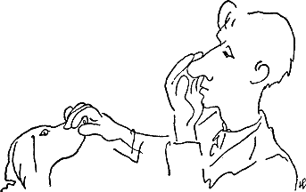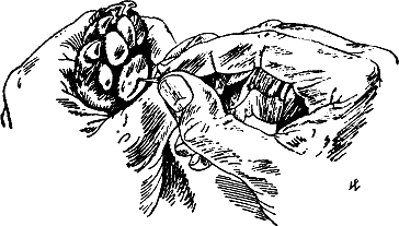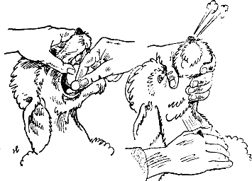 Полезно поднять голову собаки вверх, придерживая за нижнюю челюсть, чтобы она делала глотательные движения (153). После того, как лекарство вложено в пасть собаки, закройте пасть и держите ее закрытой. Одновременно помогите собаке проглотить лекарство, равномерно поглаживая ее по горлу. Пасть освободите лишь тогда, когда лекарство проглочено.