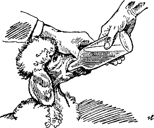 Левой рукой возьмите собаку за верхнюю челюсть, поднимите ее голову кверху и вставьте горлышко бутылочки в уголок пасти. Одновременно зажмите ей нос, – что заставит ее проглотить лекарство.