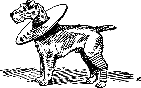 Подобные раны нельзя промывать водой, поскольку повышается опасность инфекции. После того, как рана смазана раствором йода (188), следует наложить повязку из стерильной марли, а поверх нее дополнительно полотняную повязку и крепко завязать, чтобы она не распускалась и не сбивалась. Каждая собака сразу же пытается освободиться от неприятной повязки. Поэтому на ее шею надевается специальный воротничек (см. рисунок), так называемый испанский воротничок, который делает это невозможным.