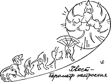 Хвост, зажатый между ног, – это недружелюбная реакция непринятия. Хвост обвислый, неподвижный – поведение неопределенности. – Выпрямленный хвост – обстановка может быстро измениться. Слабо виляющий хвост – обстановка улучшается. Энергично виляющий хвост – прекрасная, радостная обстановка. Высшая стадия собачьей эйфории: хвост не виляет, а буквально бьется, причем задняя часть туловища раскачивается, уши прижаты – высшая степень блаженства – идет любимый хозяин.