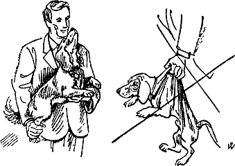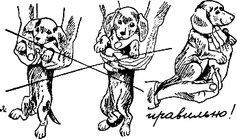 Вы допустите грубую ошибку в воспитании собаки, если будете бить ее рукой, таскать за уши или за строгий ошейник. Кроме того, не следует поднимать собаку «за шкирку» (292). Как минимум ей больно, и она просто начнет бояться вашей руки (261). Собаку надо поднимать только двумя руками. Левая рука обычно подкладывается под грудь, правая обхватывает задние лапы. Если вы поднимаете щенков или маленьких собак, ладонь нужно подкладывать под заднюю часть туловища (272).
