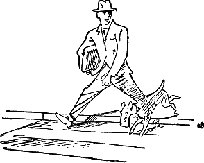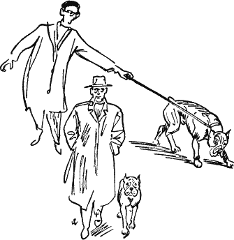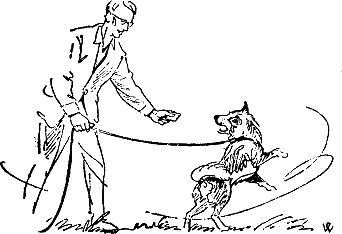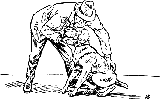 К сожалению, часто приходится видеть картину, когда хозяин, вожак стаи, покорно плетется за своим псом от дерева к углу и от угла к дереву. Ваша собака должна быть на поводке слева от вас и бежать так, чтобы ее голова и грудь находились чуть-чуть впереди вашего колена. Вначале вы идете вдоль расположенных слева стен или заборов. То, что мы начинаем идти всегда с левой ноги, является для собаки зрительным сигналом (270). Любой попытке бежать в сторону вы можете воспрепятствовать рывком удавки или строгого ошейника, при попытке убежать вперед или отстать достаточно легкого предупредительного удара тонким прутиком. Все это надо сопровождать командой «Рядом!». Время от времени надо гладить собаку, чтобы она даже при строгой дрессировке чувствовала добрую руку хозяина. Если вы останавливаетесь, ваша собака без всякой команды должна тотчас же сесть.