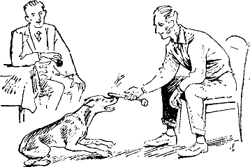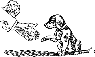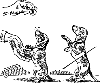 Способность собаки протягивать лапу связана с привычкой давить лапой на соски матери при сосании (386). Возьмите рукой переднюю лапу сидящей собаки и притяните ее к себе. Дайте собаке вкусный кусочек, повторя «Дай лапку!». Кусочек она получает после того, как протянет лапу. «Дай лапку!» такая же опасная игра как «Служи!» (329).