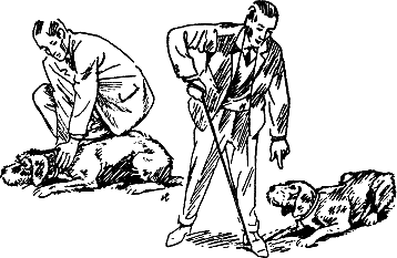 Вначале усадите собаку. Затем дается команда «Место!» или «Лежать!». Если собака легко управляема, нажмите одной рукой на ее холку и прижмите к земле, а другой потяните вперед за передние лапы. Повторяйте при этом команду «Лежать!», давая одновременно четкие сигналы движением руки (270) сверху вниз. Когда собака останется лежать, похвалите ее. Выполнение этого упражнения будет стабильнее, если вы будете притягивать собаку к земле поводком, пропущенным под подошвой ботинка. В остальном действуйте так же, как при выполнении предыдущего упражнения.
