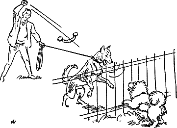 Неважно, кто или что двигается вдоль границы «владений ее стаи» (204), собака может начать, чаще всего бессмысленно, метаться, оглашая воздух яростным лаем. Наденьте на собаку строгий ошейник, пристегните длинный поводок и пойдите гулять с ней вдоль забора вашего двора, часто останавливаясь. Если пес попытается с лаем броситься вдоль забора, резко задержите его и дайте команду «Место!» (338). Любую дальнейшую попытку подобного рода необходимо пресекать таким же образом, одновременно давая команду «Фу!».
