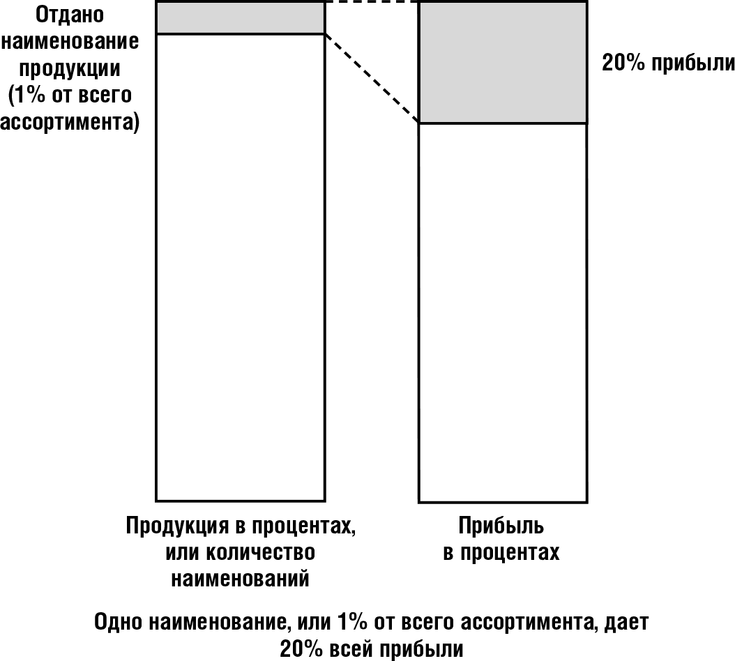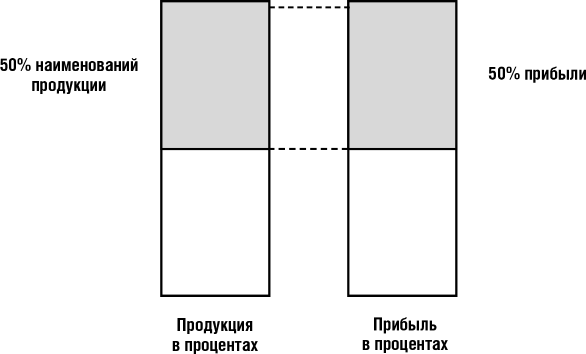 Столбец справа показывает всю прибыль компании от этих 100 товаров. Представьте, что прибыль, получаемая от одного, самого выгодного из всех товаров, показана в верхней части правого столбца. Скажем, этот наиболее выгодный товар приносит 20 % от всей прибыли. Таким образом, рисунок 2 показывает, что один товар, или 1 % всей продукции (занимающий одну сотую столбца слева), приносит фирме 20 % прибыли. Это соотношение показано серым цветом.