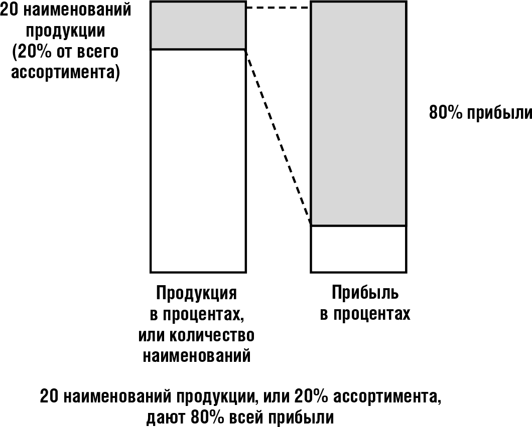 Если мы продолжим подсчет следующих товаров до тех пор, пока не будем знать прибыль, получаемую от 20 наиболее выгодных товаров, то в конце сможем закрасить правый столбец в соответствии с тем, какую долю прибыли приносят эти 20 самых прибыльных товаров. Мы показываем это на рисунке 3, на котором видно (наш выдуманный пример), что эти 20 товаров, 20 % от всего ассортимента, приносят 80 % (закрашенная область) всей прибыли. И наоборот – незакрашенная часть столбцов показывает обратную сторону соотношения: 80 % всей продукции дает лишь 20 % прибыли.