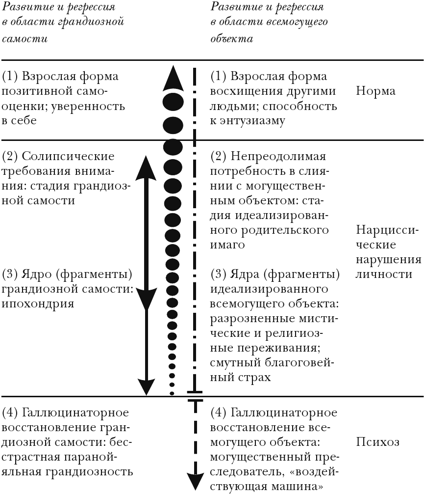 Главными отличительными особенностями психозов и пограничных состояний, с одной стороны, и доступных анализу нарциссических нарушений личности – с другой, являются: (1) первые характеризуются тенденцией к постоянному отказу от связных нарциссических конфигураций и к замещению их бредовыми и галлюцинаторными образованиями (с целью избежать невыносимого состояния фрагментации и потери архаичных нарциссических объектов); (2) в случае нарциссических нарушений личности наблюдаются лишь незначительные и временные колебания, как правило, в направлении частичной фрагментации с признаками нестойкого компенсаторного бреда. Для теоретического осмысления психозов и нарциссических нарушений личности важно исследовать сходство и различие между относительно здоровой архаичной грандиозностью, которая может поддерживаться психикой в случаях нарциссических нарушений, и безучастностью и высокомерностью, присущими психотическим маниям величия при психозах и пограничных состояниях. Точно так же важно сравнить относительно здоровое развитие нарциссически катектированного всемогущего и всеведущего, возвеличенного и идеализированного, эмоционально подкрепляемого родительского имаго, формируемого при переносе пациентами с нарциссическими нарушениями личности, со всемогущим преследователем и манипулятором самости при психозах: с той «воздействующей машиной», чье всемогущество и всеведение превращаются в безучастное, лишенное тепла и сопереживания бесчеловечное зло. И, наконец, что не менее важно, исследование предпсихотической личности с точки зрения уязвимости присущих ей высших форм нарциссизма (а не только с точки зрения хрупкости зрелого ее отношения к объектам любви) может во многом способствовать пониманию психозов и пограничных состояний и, например, объяснить две следующие типичные особенности: (1) события, вынуждающие совершить первые важнейшие шаги в регрессивном движении, часто относятся к области нарциссической травмы, а не к сфере объектной любви; (2) даже при самых тяжелых психотических нарушениях объектная любовь может оставаться в целом сохранной, но не бывает так, чтобы отсутствовали глубокие нарушения в нарциссической сфере.