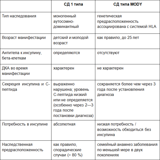 Диабет типа LADA (латентный аутоиммунный диабет взрослых) классифицируется как подтип СД 1 типа и занимает промежуточное место между классическим СД 1 типа и СД 2 типа. Клиническая картина LADA напоминает таковую у больных СД 2 типа: характерен субклинический дебют заболевания, медленное прогрессирование симптомов, не наблюдается склонность к ДКА, однако для пациентов с LADA не характерно ожирение. Медленное прогрессирование деструкции β-клеток объясняет удовлетворительную компенсацию углеводного обмена при приеме ПССП в первые годы заболевания. Лабораторные исследования выявляют наличие как минимум одного вида антител к островковому аппарату ПЖ (чаще всего GAD и ICA), а также сниженный, но определяемый уровень С-пептида как в дебюте заболевания, так и через 3–5 лет после постановки диагноза, в связи с чем потребность в инсулине появляется не ранее чем через 6 месяцев после манифестации [19, 20].