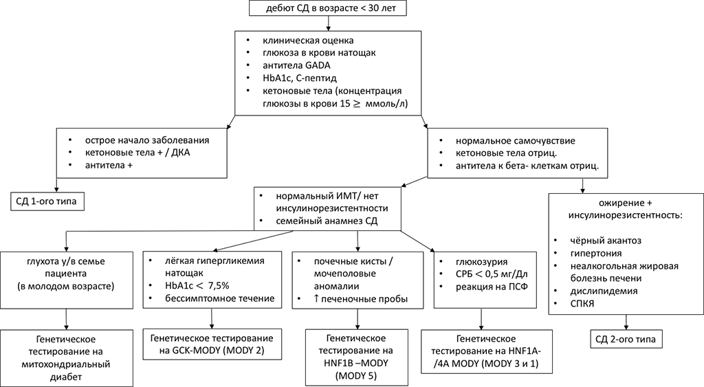 Молекулярное-генетическое исследование, направленное на выявление мутаций генов, ассоциированных с развитием СД типа MODY, рекомендуется проводить детям и молодым людям с СД, клинические проявления которого не соответствуют картине СД 1 и 2 типа (отсутствие антипанкреатических антител, ожирения и т. д.), при наличии у них семейного анамнеза СД в нескольких последующих поколениях [3, 15], умеренной гипергликемии, длительного «медового месяца» свыше 1 года или необычно низкой потребности в инсулине (менее 0,5 ЕД/кг/сут) при длительности СД более года [16].