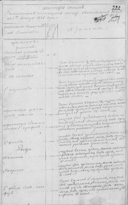 "Имянной список раскольников состоящих на лицо в Опоческом уезде к 1-му генваря 1825 году" (ГАПО. Ф. 20. Оп. 1. Д. 650. Л. 222)