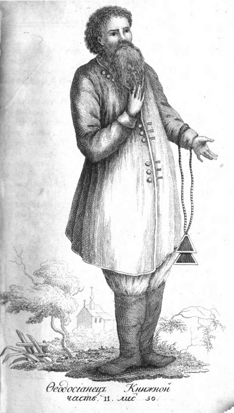 «Феодосианец книжной». Гравюра из книги А. И. Журавлева «Полное историческое известие о древних стригольниках и новых раскольниках, так называемых старообрядцах…» (1795)