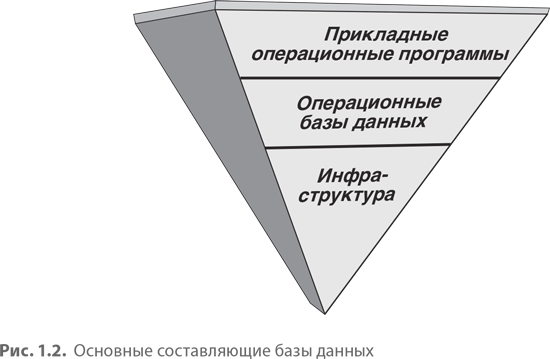 Обратим внимание на нижнюю часть рис. 1.1. Здесь располагаются дорогостоящие ИТ-системы, занимающиеся обработкой транзакционных данных. На рис. 1.2 показана в увеличенном виде нижняя часть пирамиды с рис. 1.1. В упрощенном виде он изображает три уровня программного обеспечения в центре обработки и хранения данных отдела информационных технологий.