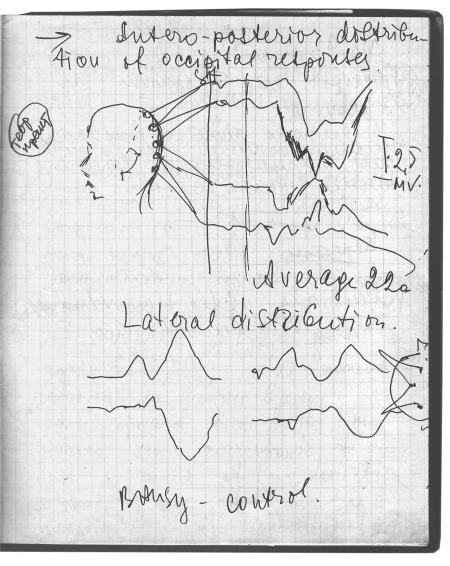 Увидела она и существенно более продвинутый, по сравнению с другими лабораториями, автоматизированный метод обработки ЭЭГ. В тетрадке все подробно описано и зарисовано: как вводить электроды, какие приборы понадобятся, как описывается ЭЭГ, как ставится диагноз при опухолях. Это ведь было одной из самых сложных проблем в то время, в отсутствие томографов, – только симптомы, которые были у больного, и электроэнцефалография. Она сама тогда активно работала над концепцией диагностики опухолей мозга с помощью ЭЭГ и, в частности, защитной роли так называемых медленных волн (открытых Г. Уолтером). «Медленных» – потому что частота ритма энцефалограммы в окрестности опухоли снижается, и считалось, что это связано с мобилизацией защитных сил мозга.