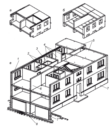 Рис. 1.5. Конструктивные схемы бескаркасных зданий: а – с поперечными и продольными несущими стенами; б – с продольными несущими стенами; в – крупнопанельный дом с поперечными несущими стенами; 1 – наружные панели; 2 – санитарно-технические кабины; 3 – ненесущие перегородки; 4 – несущие стены-перегородки; 5 – панели перекрытий; 6 – внутренняя продольная стена; 7 – цокольные панели; 8 – блоки фундамента