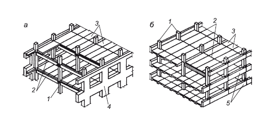 Рис. 1.6. Конструктивные схемы каркасных зданий: а – с самонесущими стенами; б – с навесными стенами; 1 – колонны; 2 – ригели;3 – плиты перекрытий; 4 – стены самонесущие; 5 – навесные панели