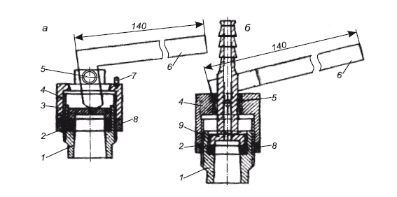 Рис. 2.1. Эксцентриковые заглушки: а – глухая; сквозная; 1 – корпус; 2 – резиновое кольцо; 3 – упорный поршень; 4 – крышка; 5 – ось; 6 – эксцентриковая ручка; 7 – упор; 8 – контргайка; 9 – штуцер